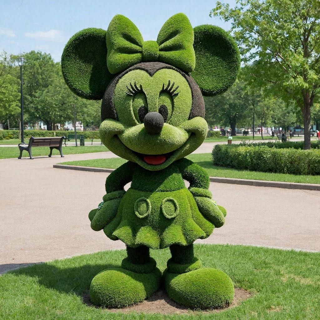 Топиари будет с радостью приветствовать новых гостей. Она выполнена из экологически безопасных материалов, способна прослужить более 20 лет. Мышонок – самый популярный персонаж мультфильмов в мире, его история успехов пережила уже несколько десятилетий. Топиари призваны разнообразить ландшафт городских парков и приусадебных участков, он хорошо смотрятся среди зелени кустарников, особенно когда в качестве покрытия используется искусственный газон разных цветов.